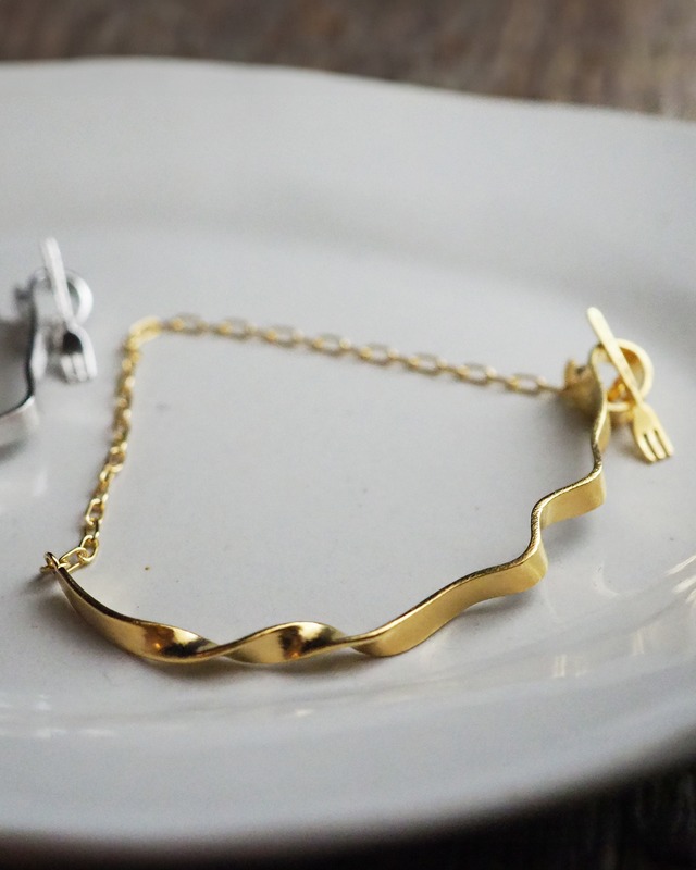 Fettuccine_Bracelet /フェットチーネのバングル ーーーーーーーーーーーーーーーーーーーーーー ■DESIGN CONCEPT ーーーーーーーーーーーーーーーーーーーーーー しなやかなリボンのように、1本のフェットチーネをモチーフにデザインしたブレスレットです。 「フェットチーネ」はイタリア語で“小さなリボン”を意味し、平たく幅のあるパスタとしても知られています。 緩やかなウェーブやひねりを加えたデザインが、軽やかな動きを演出。 T字の留め具には、遊び心を込めて小さなフォークをあしらいました。 全長は約17cm。モチーフのデザインの特徴状、長さはおおよそとなります。 ソースが絡みやすいようなイメージで表面は鏡面を少し押さえた仕上げをしております。 プレゼントにもおすすめです。 ーーーーーーーーーーーーーーーーーーーーーー ■MATERIALS ーーーーーーーーーーーーーーーーーーーーーー SILVER / K18 gold plated (K18ゴールドメッキ)※ニッケルフリー / Rhodium plated(ロジウムメッキ)※ニッケルフリー カラーをお選びいただけます。 ーーーーーーーーーーーーーーーーーーーーーー ■SIZE ーーーーーーーーーーーーーーーーーーーーーー モチーフ部分:約8cm 全長:約17cm ーーーーーーーーーーーーーーーーーーーーーー ■STOCK&SHIPPING ーーーーーーーーーーーーーーーーーーーーーー こちらの商品は店頭でも販売しております。 在庫数と実際の販売状況に差が生じる場合がございます。 納期についてはご購入後ショップから直接メールにてご連絡いたします。 在庫あり/通常ご注文から1~3日前後で発送予定 製作/14日前後 宅配便にて配送いたします。 お受け取りのご希望曜日などがございましたら、備考欄にご記入ください。 ーーーーーーーーーーーーーーーーーーーーーー ■GIFTについて ーーーーーーーーーーーーーーーーーーーーーー ギフトをお選びの方、ボックスにリボンをかけてお送りいたします。