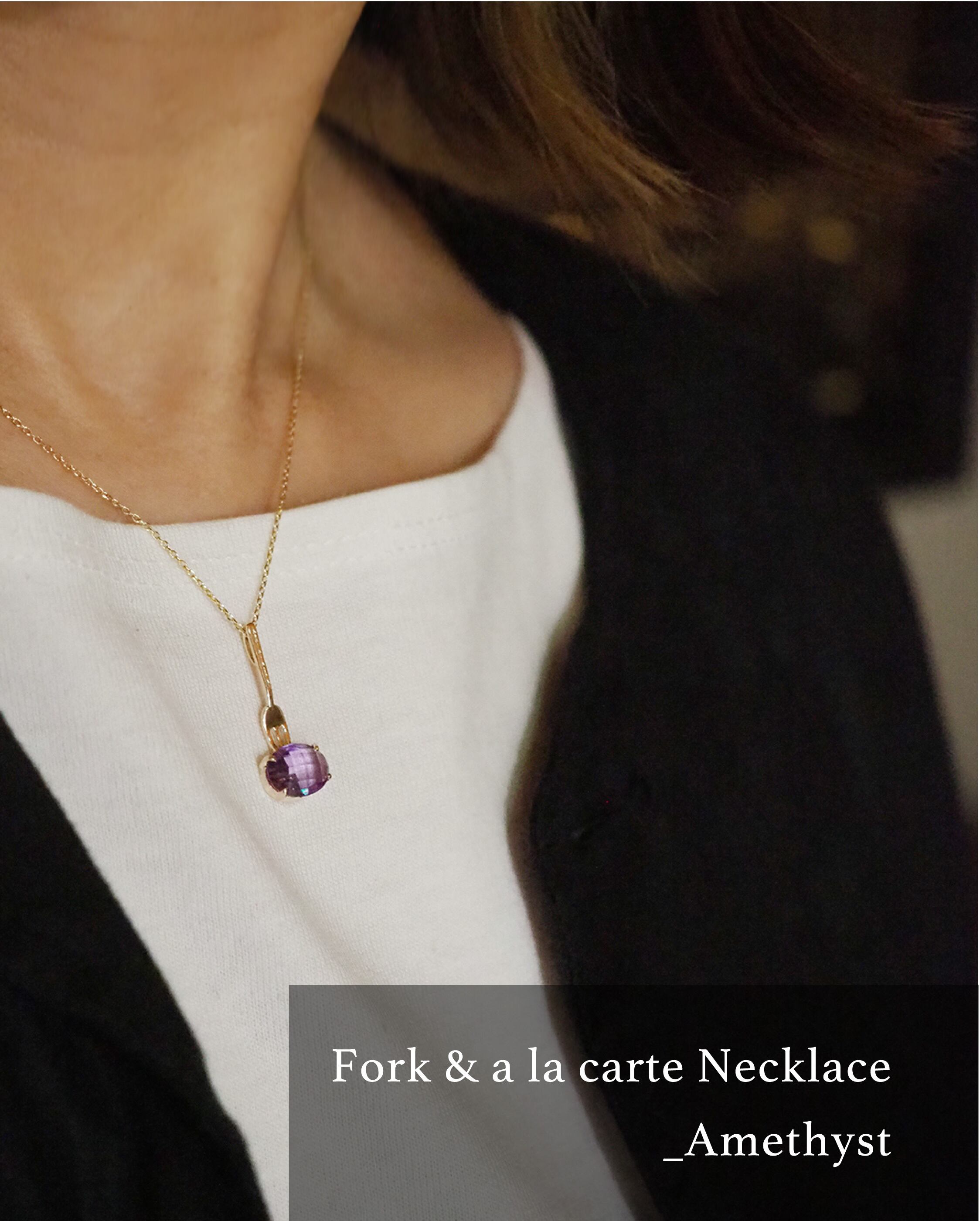 ペンダントトップのバチカン部分がフォークになって、おいしそうに見える天然石をいただくようなイメージでデザインしました。