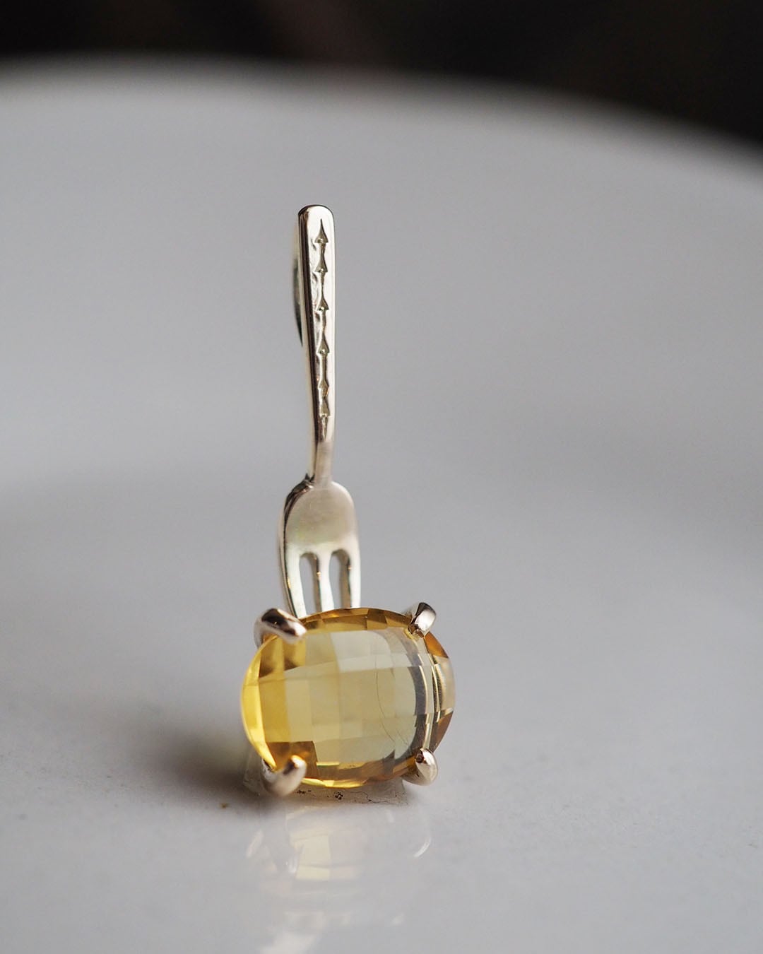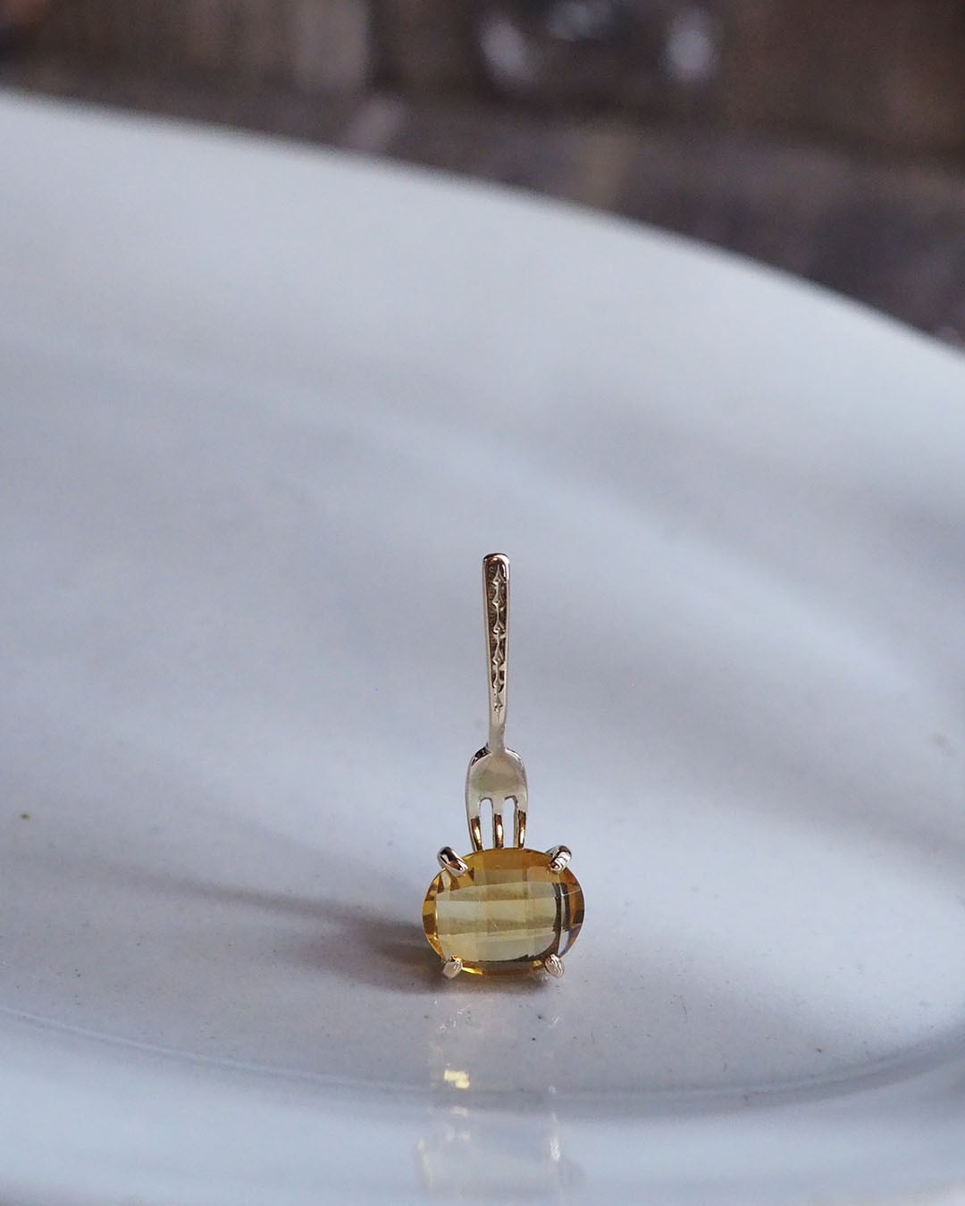 淡い黄金色の光が、カットの面に反射し、フォークと石座の優しいK10ゴールドカラーとマッチ。