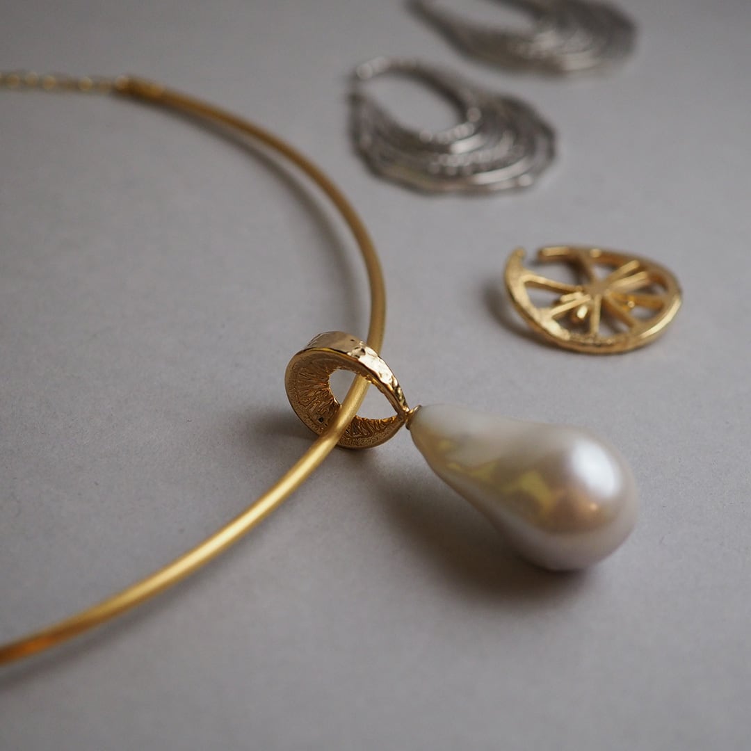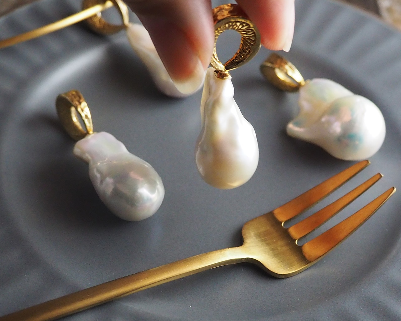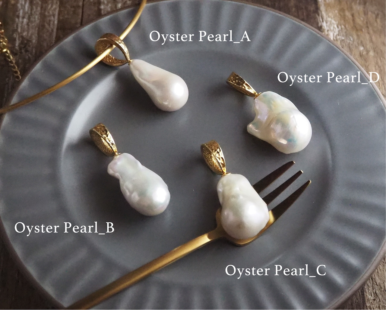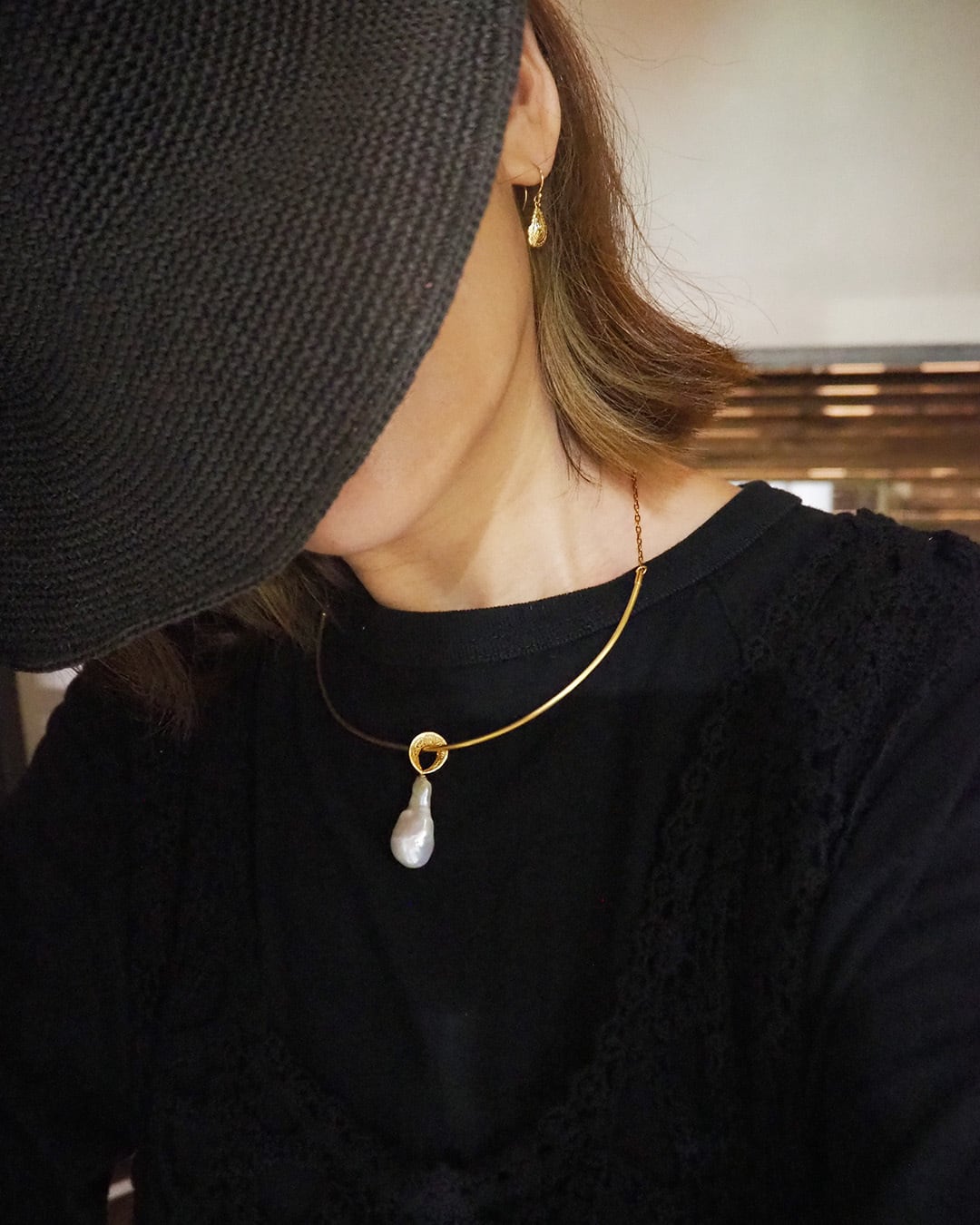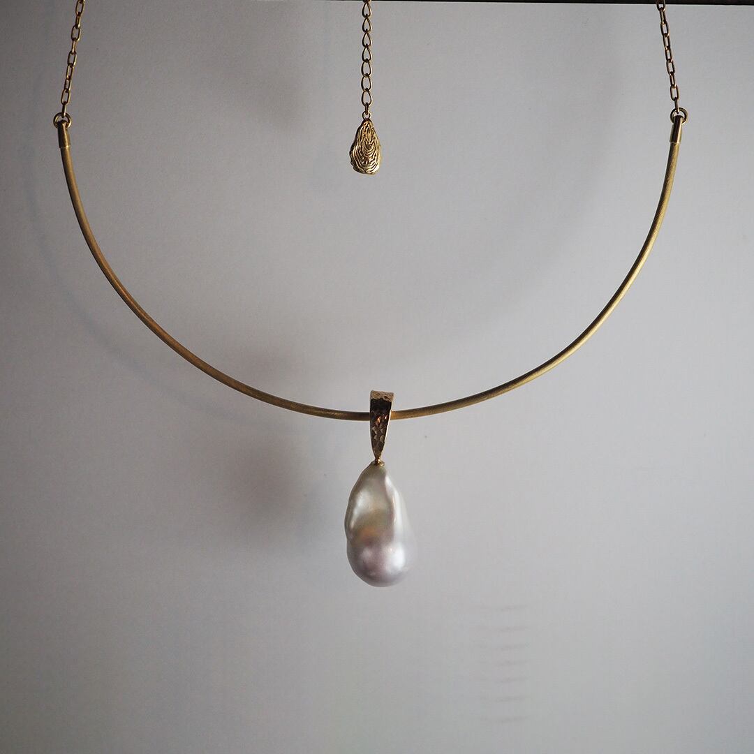 トップのオイスターパールは形が不揃いで同じものがない1点もの。