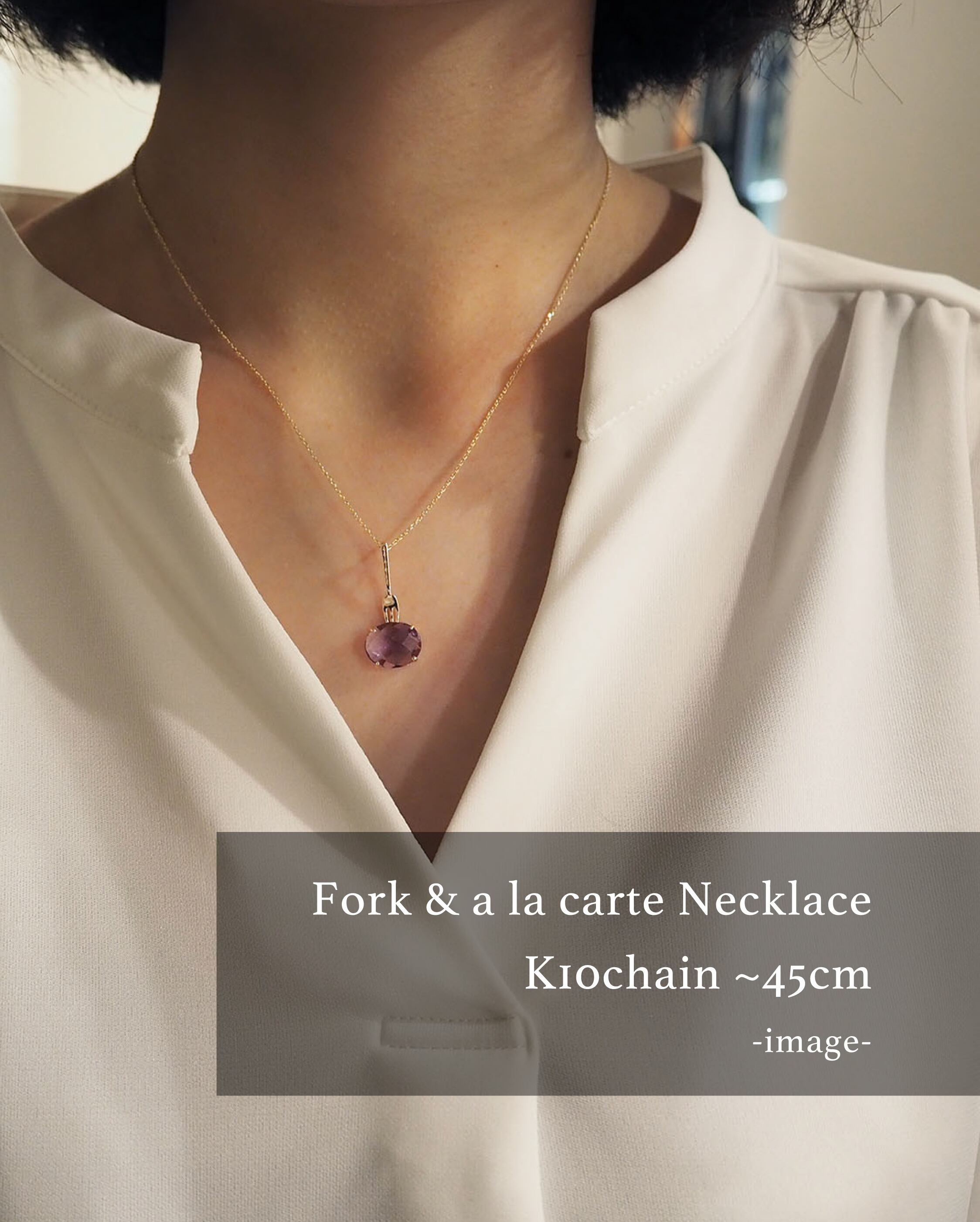 ペンダントトップのバチカン部分がフォークになって、おいしそうに見える天然石をいただくようなイメージでデザインしました。