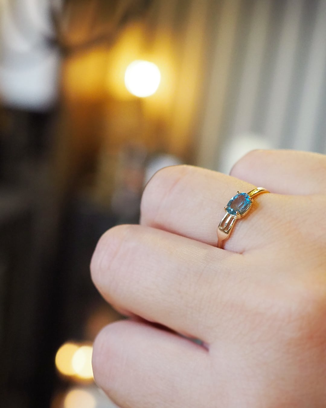 同じ色はないファンシーカラーのトパーズがフォークの優しいK10ゴールドカラーとマッチ。