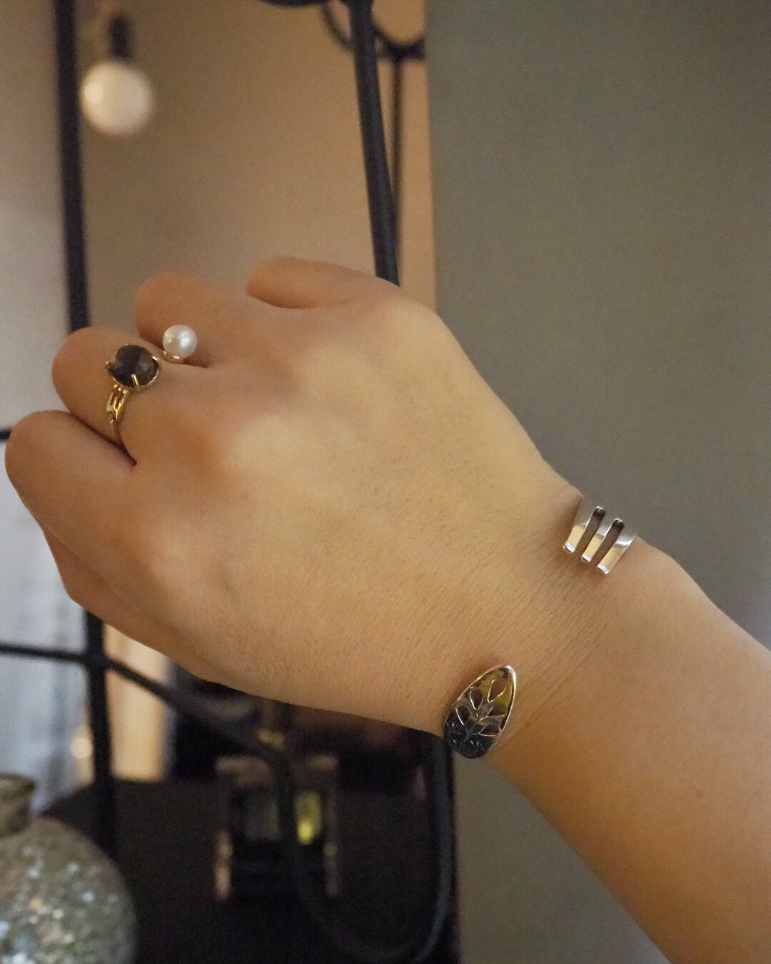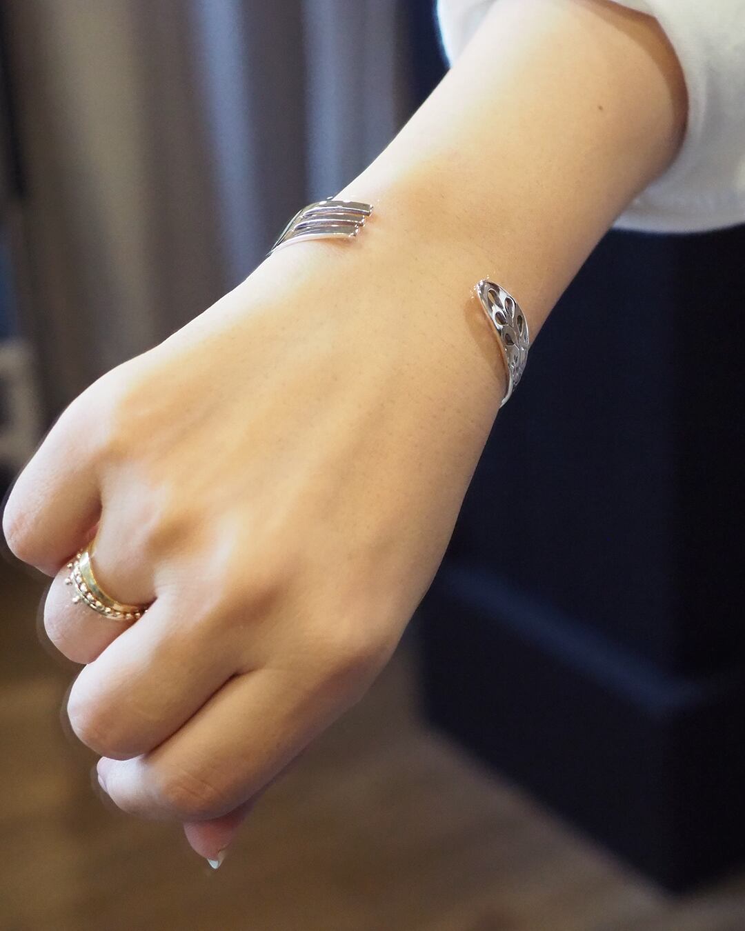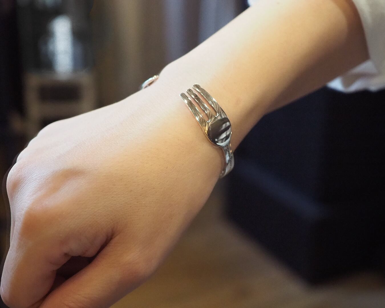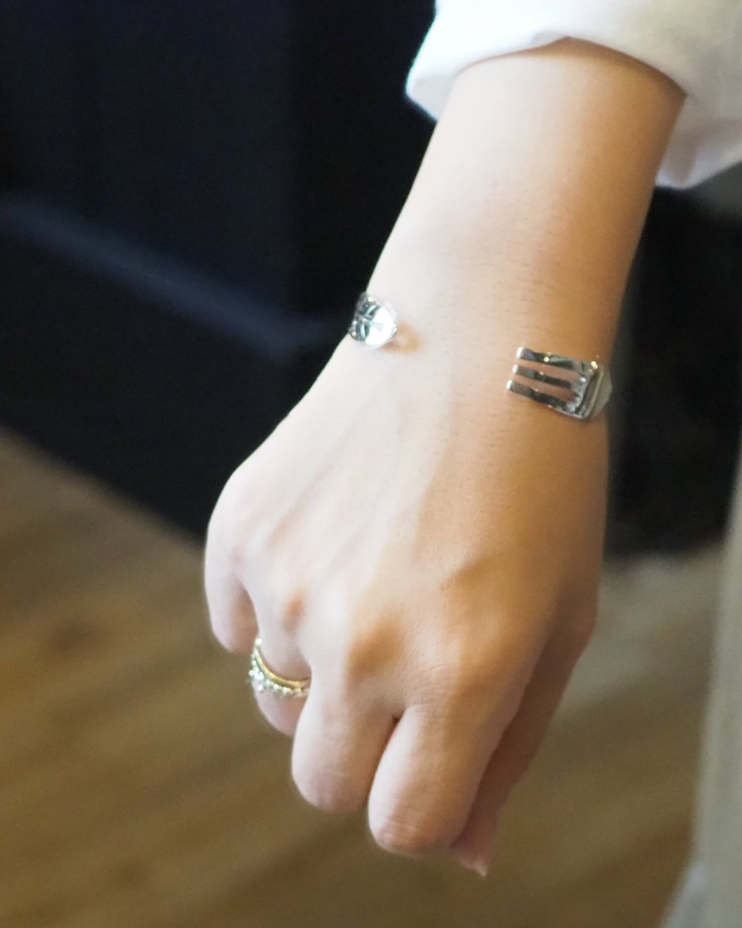 フォークが見えるように着用したり、フォークの細い柄を前に着けてまた違った印象のバングルにしたり、お好みに合わせてご着用いただけます。