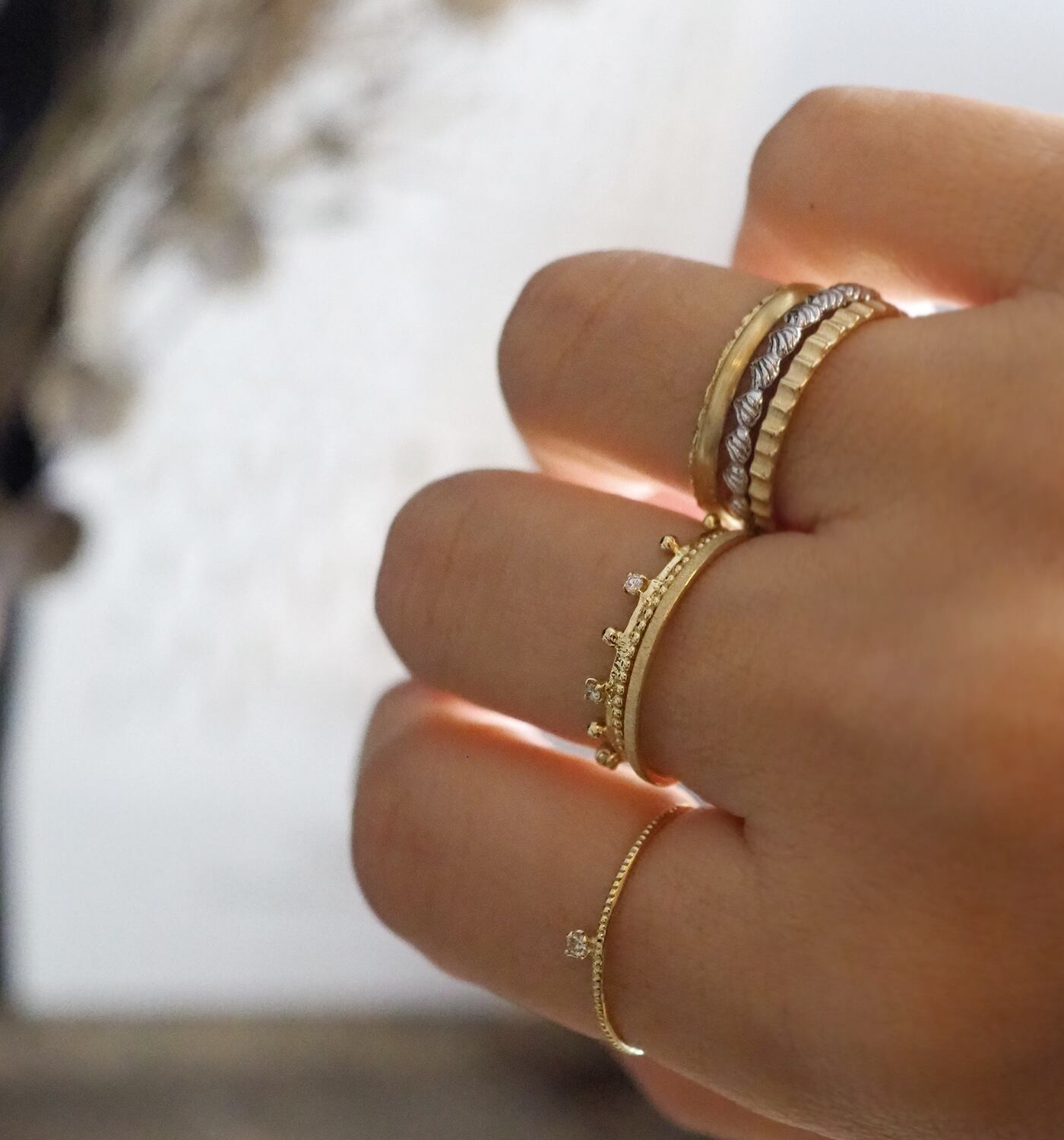 ひとつのリングとしてお楽しみいただけるのはもちろん、ほかのA:ミルフィーユリングシリーズと合わせて重ね着けデコレーションするのもおすすめです。またお手持ちのリングとも相性良く合わせていただけます。