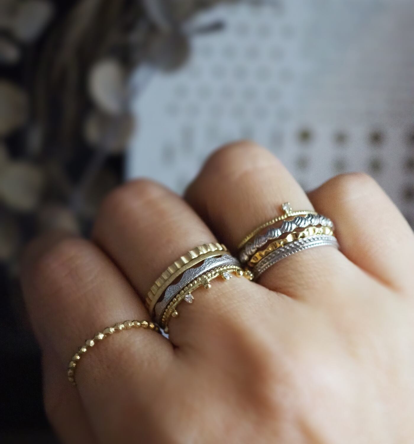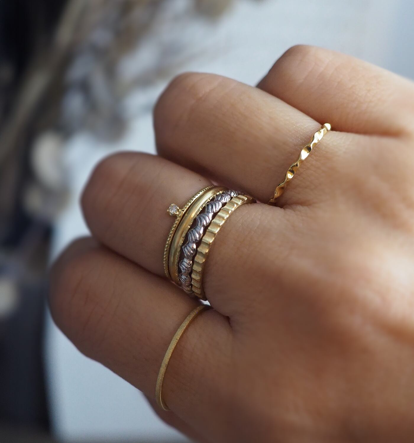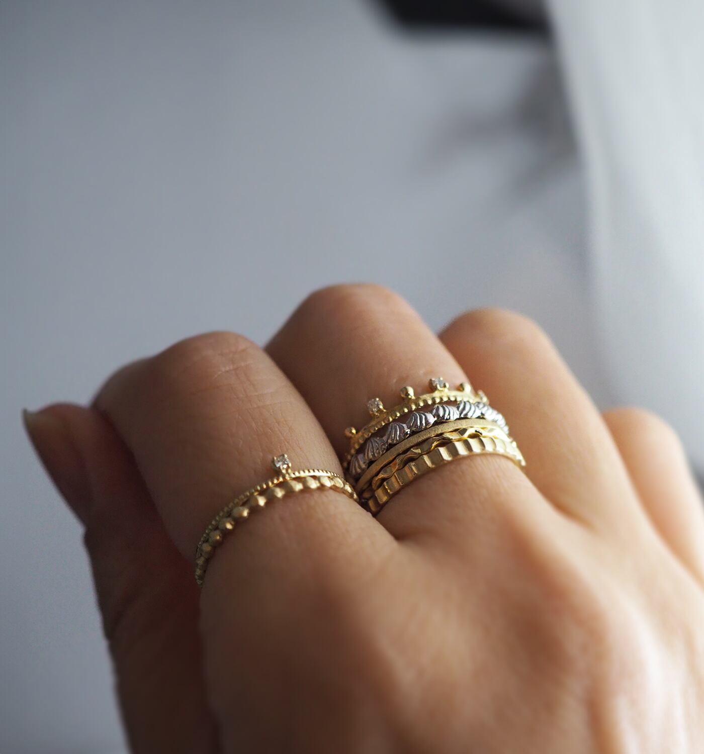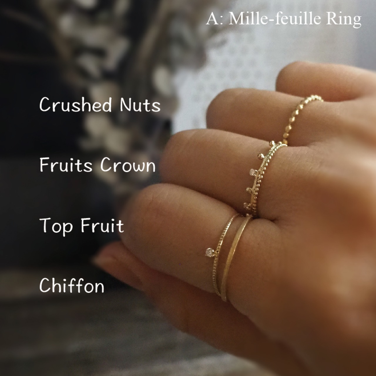 ひとつのリングとしてお楽しみいただけるのはもちろん、ほかのA:ミルフィーユリングシリーズと合わせて重ね着けデコレーションするのもおすすめです。またお手持ちのリングとも相性良く合わせていただけます。