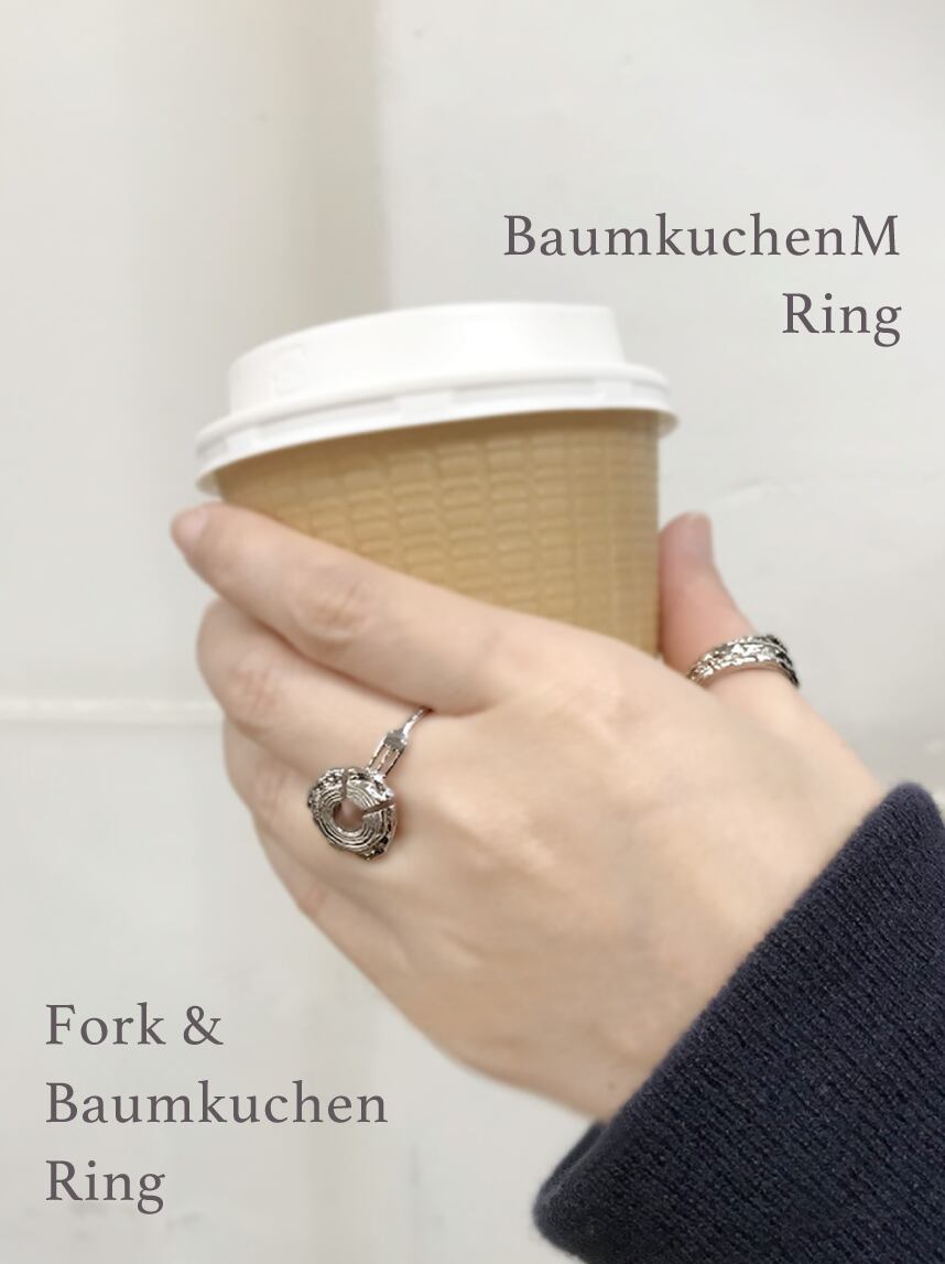 U字型のリングはあえて、フォークが見えるように、指と指の間に(小指側)バームクーヘンがくるデザインとなっております。重みとバランスが絶妙の安定感で意外と着けやすリングです。