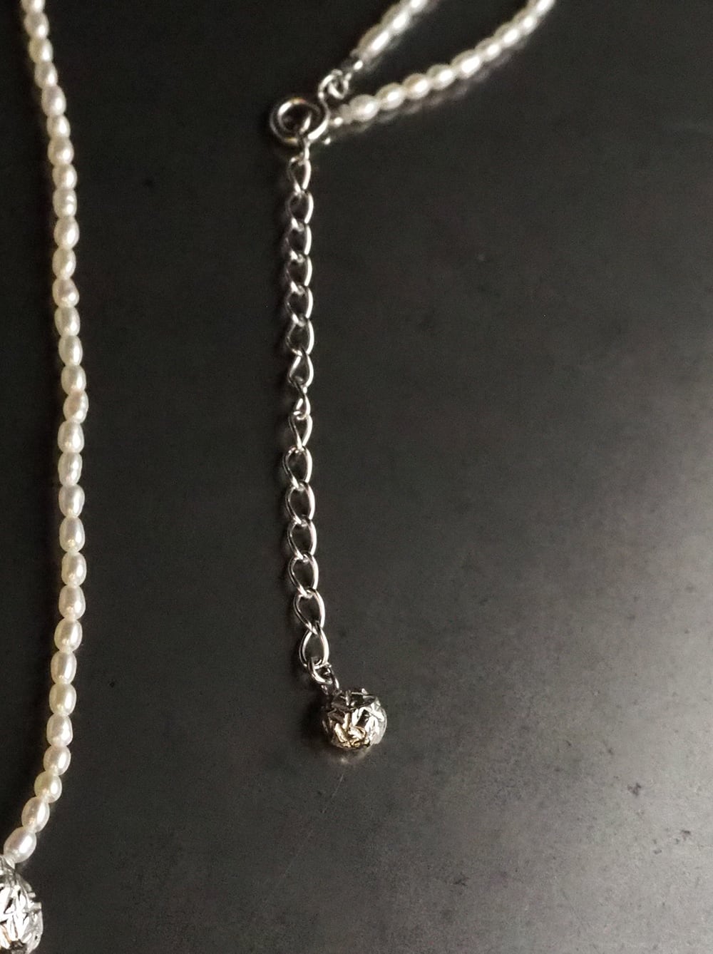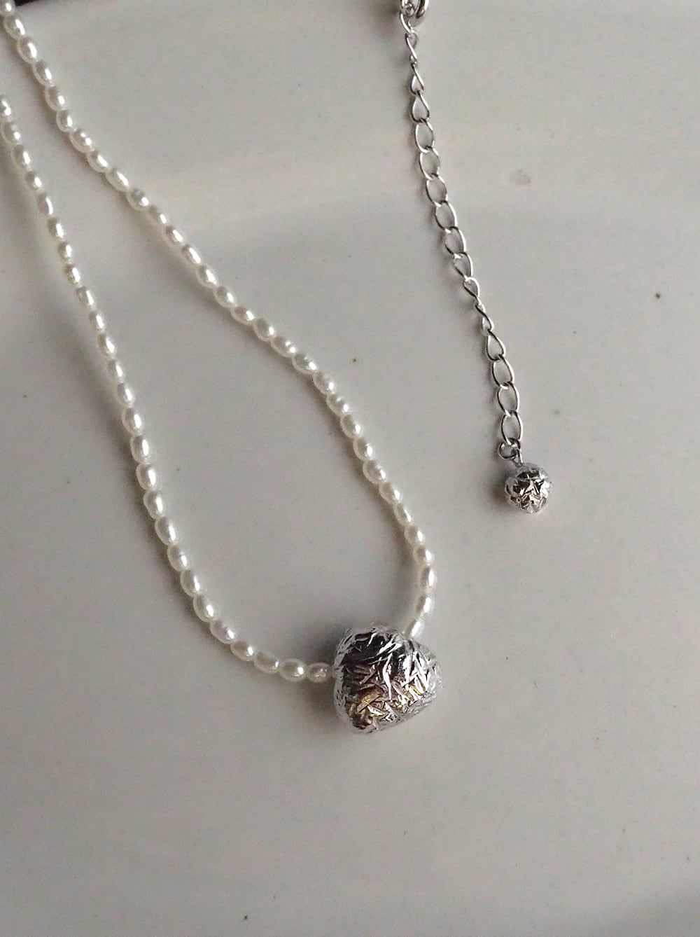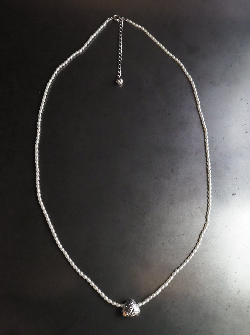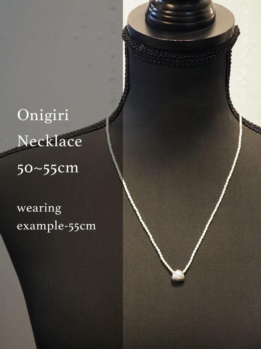 おにぎりと言えばお米。コメ粒イメージで不揃いな並び方のライスパールが連になったネックレスにおにぎりを通したデザイン。