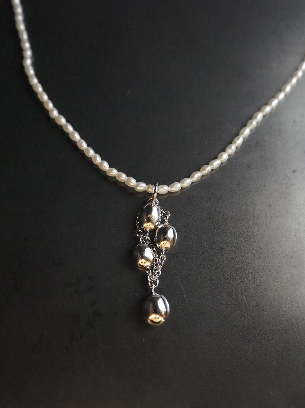 もっさりと糸に絡まったなっとうイメージのトップと、ご飯のコメ粒イメージでライスパールを使用したネックレスで、説明だけだとなんとも言えないモチーフを、ジュエリーとしてキレイめにデザインしてみました。