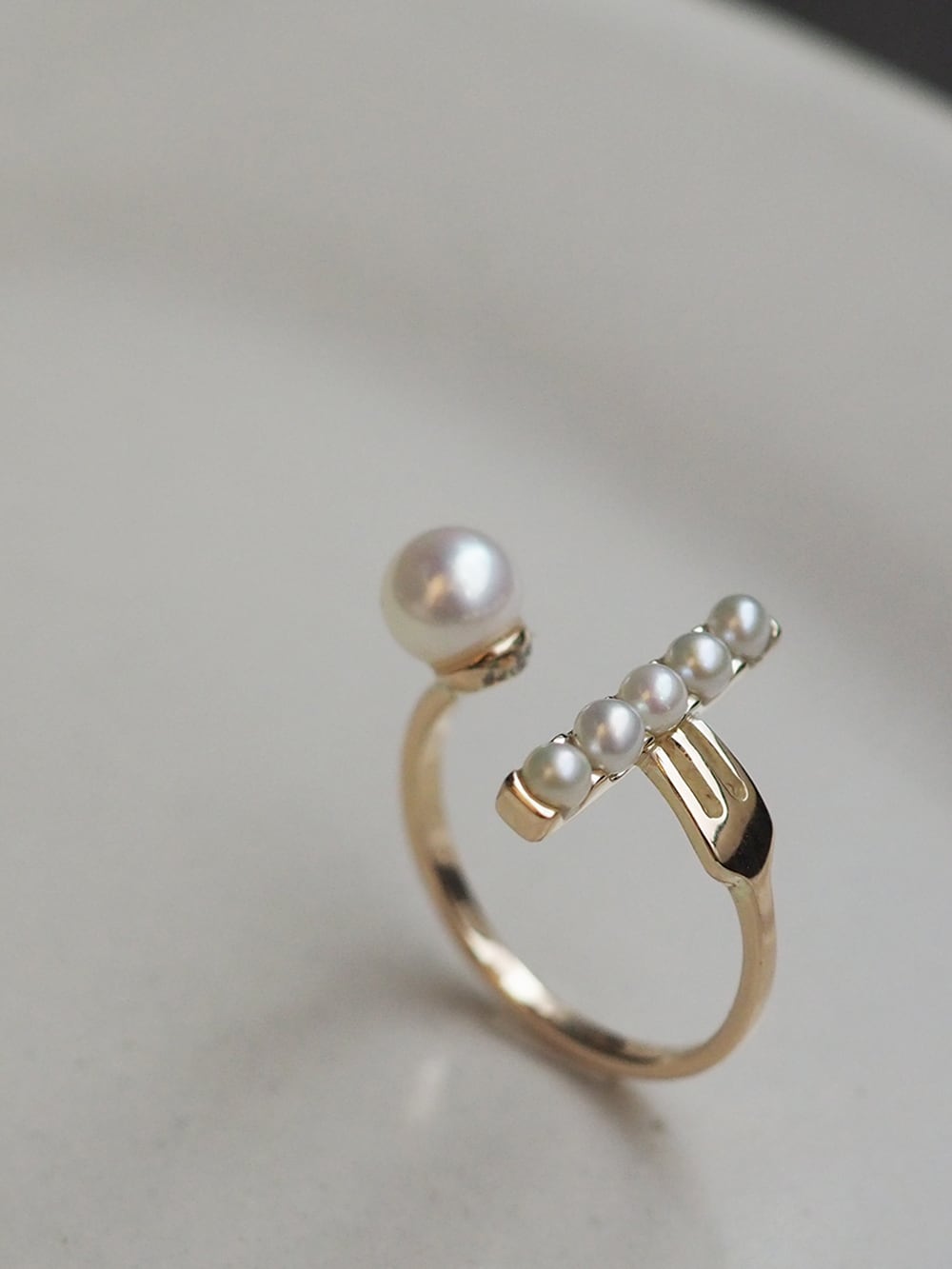 K10ゴールドの棒状の石座に縦に並んだ5連の小さなパールがクールでありながらクラシカルな印象で、丸玉パールとのバランスが個性的なデザインを際立てます。