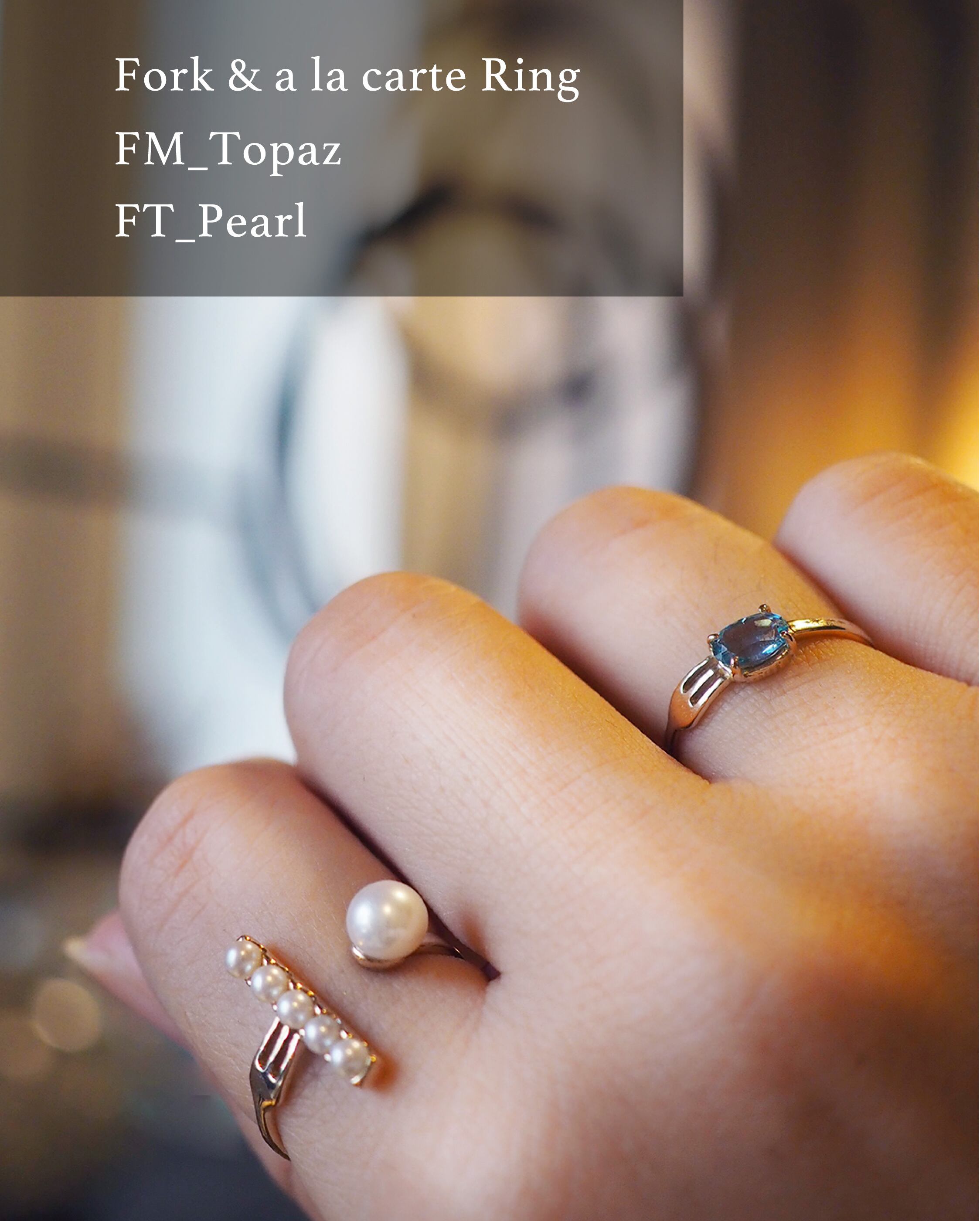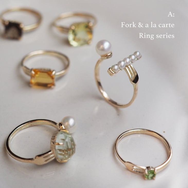 リング部分は、おいしそうに見えるパールをいただくようなイメージでチラリとフォークが見えるデザインに。オープンリングの呼び名で”フォークリング”をそのままフォークのフォークリングにすることでさりげなくユーモアをプラス。