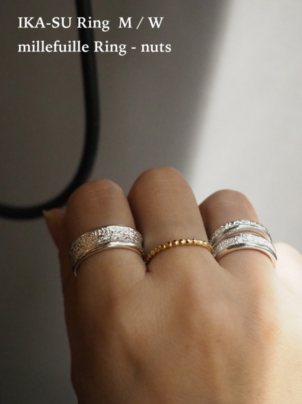 見た目は鏡面とテクスチャーのコントラストにシンプルでありながらボリューム感のあるフォルムで、普段使いはもちろん、重ね着けやほかのリングとも相性が良くクールにご使用いただけるデザインに。