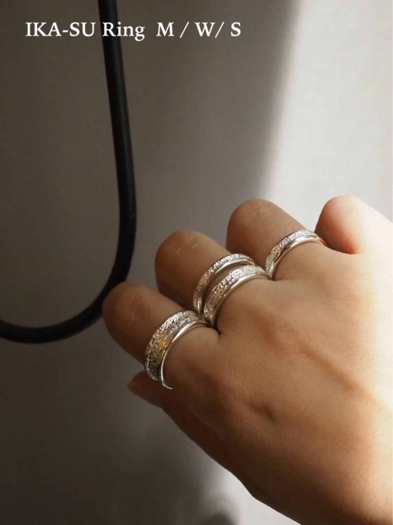 「イカしている」という日本語の遊び心を取り入れ、身につけることでファッションのアクセントになれるリングという意味合いも込めたIKA-SU Ring(イカスリング)は、カットしてからボイルしたイカをシルバーで表現した指輪です。